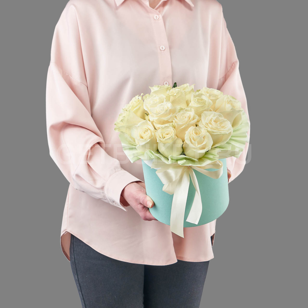 Композиция из белых роз в шляпной коробке
