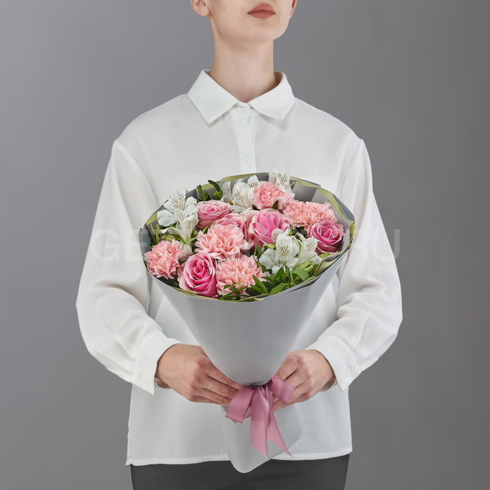 Нежный букет из розовых роз, белых гвоздик и альстромерии5 970 ₽Нежный букет из розовых роз, белых гвоздик и альстромерии 5 970 ₽ -